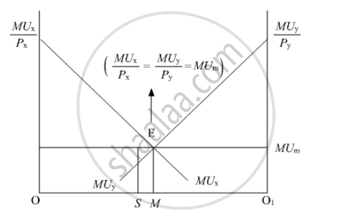 In the diagram, OO1 represents the total income of a consumer. MUx and MUy represent the Marginal Utility curves of commodity X and commodity Y, respectively. Equilibrium is established at point E, where, MUx and MUy intersect each other and with MUy.