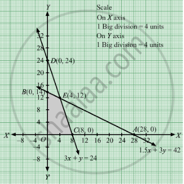 The feasible region determined by the system of constraints 1.5x + 3y ≤ 42, 3x + y ≤ 24, x ≥ 0 and y ≥ 0 are as follows.