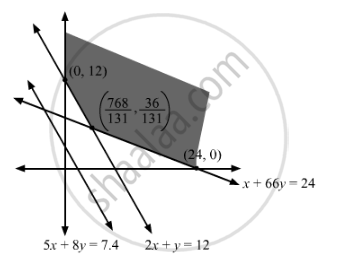\[\begin{array}{lc}2x + y \geq 12 & \\ 5x + 8y \geq 7 . 4 & \\ x + 66y \geq 24 &\end{array}\]