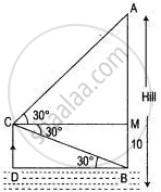 A man is standing on the deck of a ship, which is 10 m above water level. He observes the angle of elevation of the top of a hill as 60° and the angle of depression of the base of the hill as 30°. Calculate the distance of the hill from the ship and the height of the hill.