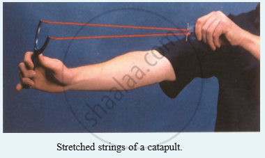 What type of energy is possessed : by the piece of stone which is thrown away on releasing the stretched rubber strings of catapult?