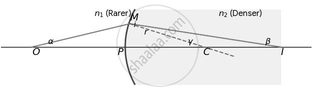 For a point object placed in a rarer medium (n1) in front of a convex spherical surface of a denser medium (n2), the relationship between object distance (u), image distance (v), and radius of curvature (R) is given by: