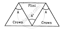 Three thin prisms are combined as shown in figure. The refractive indices of the crown glass for red, yellow and violet rays are μr, μy and μv respectively and those for the flint glass are μ'r, μ'y and μ'v respectively. Find the ratio A'/A for which (a) there is no net angular dispersion, and (b) there is no net deviation in the yellow ray.