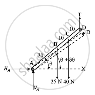 A rod AD of length 40 cm is suspended from point D as shown in figure. If it has a weight of 25 N and also supports a load of 40N,find the tension in the cable using the method of virtual work.Take AC=30 cm.