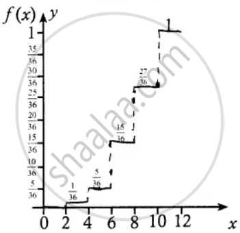 F(x) = `{{:(0",", "For" - oo < x < 2),(1/36",", "For" 2 ≤ x ≤ 4),(5/36",", "For" 4 ≤ x < 6),(15/36",", "For" 6 ≤ x < 8),(27/36",", "For" 8 ≤ x < 10),(1",", "For" 10 ≤ x < oo):}`
