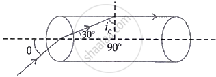 A transparent solid cylindrical rod (refractive index `2/sqrt 3`) is kept in air. A ray of light incident on its face travels along the surface of the rod, as shown in figure. Calculate the angle θ.