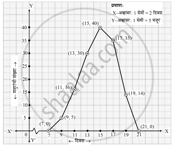 | वारंवारता (मजुरांची संख्या) | 0 | 5 | 16 | 30 | 40 | 35 | 14 | 0 |
