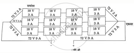 एका सौर पॅनेलपासून 18 V विभवांतर आणि 3 A विद्युतधारा मिळते. 72 V विभवांतर आणि 9 A विद्युतधारा मिळवण्यासाठी सौर पॅनेल वापरून सौर ॲरे कशा प्रकारे बनवता येईल याची आकृती काढा. आकृतीत तुम्ही सौर पॅनेल दर्शविण्यासाठी विद्युत घटाचे चिन्ह वापरू शकता.