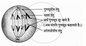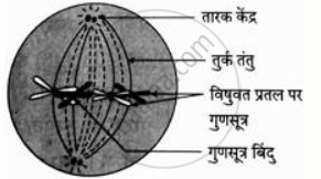 (ii) मध्यावस्था (Metaphase): सभी गुणसूत्रों का घनीभवन/वलीभवन पूर्ण हो जाता है। तत्पश्चात प्रत्येक गुणसूत्र अपने अर्धगुणसूत्र जोड़ी के साथ स्पष्टरूप से दिखाई देते हैं। सभी गुणसूत्र कोशिका के निरक्षीय समतल प्रतल (विषुववृत्तीय प्रतल) में दिखाई देते हैं। दोनों तारकेंद्र (तारककेंद्र) तथा प्रत्येक गुणसूत्र के गुणसूत्रबिंदु के मध्य विशेषप्रकार लचिले प्रथिन के धागे या तुर्कतंतु का निर्माण होता है। केंद्रक आवरण पूर्णतः नष्ट हो जाता है।