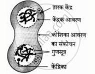 (iv) अंत्यावस्था (Telophase): अंत्यावस्था में होने वाली प्रक्रिया पूर्वावस्था की प्रक्रियाओं की विपरीत होती है। इस अवस्था में कोशिका के दोनों सिरों तक पहुँचे हुए प्रत्येक गुणसूत्रों का विसंघनन/अमलीभवन होता है। जिससे प्रत्येक गुणसूत्र पुनः पतले लचिले धागे के समान परिवर्तित होकर अदृश्य हो जाते हैं। एक कोशिका में दो संतति केंद्रक निर्मित होते हैं। संतति केंद्रक में केंद्रिकाएँ भी दिखाई देने लगती हैं। तुर्कतंतु पूर्णत: नष्ट हो जाते हैं।