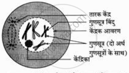 (i) पूर्वावस्था (Prophase): इस अवस्था के समय गुणसूत्रों का वलीभवन/घनीभवन होना आरंभ होता है। पतले और नाजुक धागे के समान गुणसूत्र मोटे होते जाते हैं। ये गुणसूत्र अपने अर्धगुणसूत्र जोड़ी से साथ दिखाई देते हैं। प्राणी कोशिका में तारकेंद्र (तारकेंद्र) द्विगुणित होते हैं। तथा कोशिका के दोनों सिरों की ओर जाते हुए दिखाई देते है। केंद्रक आवरण और केंद्रिका (nucleolus) लुप्त होने लगते हैं।