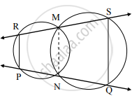 आकृती मध्ये, दोन वर्तुळे एकमेकांना बिंदू M व N मध्ये छेदतात. बिंदू M व N मधून काढलेल्या वृत्तछेदिका बिंदू R व S मध्ये, आणि बिंदू P व Q मध्ये छेदतात. तर रेख PR || रेख QS, हे सिद्ध करा.
