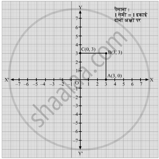 दिए गए बिंदु A(3, 0), B(3, 3) और C(0, 3) हैं। इन बिंदुओं को निर्देशांक स्तल पर निम्नानुसार आलेखित करने के बाद: