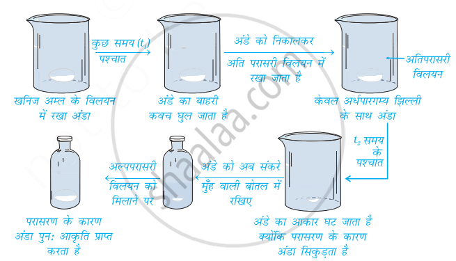 (i) जब अंडे को खनिज अम्ल के विलयन में रखा जाता है तब कठोर बाहरी अंडे की परत उसके अर्धपारगम्य मेनब्रेन को नुकसान पहुंचाए बिना घुल जाती है/हटा दी जाती है।