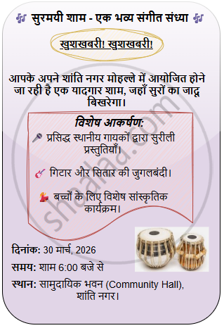 आपके मुहल्ले में एक संगीत संध्या का आयोजन होने जा रहा है। इसके अधिकाधिक प्रसार के लिए एक विज्ञापन लगभग 25-50 शब्दों में तैयार कीजिए।