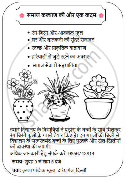 आपके विद्यालय के विद्यार्थियों ने ‘पड़ोस के बच्चों’ के साथ मिलकर कुछ फूलों के गमले तैयार किए हैं, जिन्हें बेचकर बच्चों के लिए पुस्तकें एवं खेल-खिलौनों की व्यवस्था की जाएगी। गमलों की बिक्री के लिए विज्ञापन तैयार कीजिए।