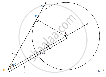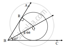 ∠ABC = 60°. ∠ABC चा दुभाजक काढा. कोनदुभाजकावर बिंदू Q असा घ्या, की d(B,Q) = 8 सेमी. Q केंद्र असलेले असे वर्तुळ काढा, की किरण BA व किरण BC ला स्पर्श करेल. वर्तुळाची त्रिज्या व स्पर्शिकाखंडाची लांबी लिहा.