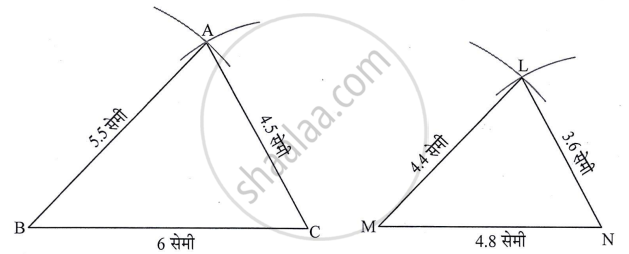ΔABC ∼ ΔLMN, ΔABC असा काढा, की AB = 5.5 सेमी, BC = 6 सेमी, CA = 4.5 सेमी आणि `"BC"/"MN" = 5/4` तर ΔABC व ΔLMN काढा.