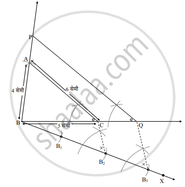 ΔABC ∼ ΔPBQ, ΔABC मध्ये, AB = 4 सेमी, BC = 5 सेमी, AC = 6 सेमी. त्रिकोणाच्या संगत बाजूंचे गुणोत्तर 2:3 असल्यास ΔPBQ काढा.
