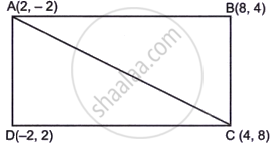 ABCD is a rectangle with its vertices at (2, –2), (8, 4), (4, 8) and (–2, 2) taken in order. Length of its diagonal is `underlinebb(2sqrt(26))`.