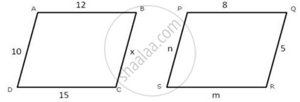 ABCD and PQRS are similar figures. AB= 12cm, BC=x cm, CD= 15 cm, AD= 10 cm, PQ= 8 cm, QR = 5 cm, RS = m cm and PS = n cm .Find the values of x, m and n.