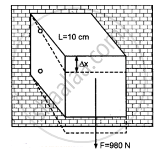 ऐलुमिनियम के किसी घन के किनारे 10 cm लंबे हैं। इसकी एक फलक किसी ऊर्ध्वाधर दीवार से कसकर जड़ी हुई है। इस घन के सम्मुख फलक से 100 kg का एक द्रव्यमान जोड़ दिया गया है। ऐलुमिनियम का अपरूपण गुणांक 25 GPa है। इस फलक का ऊर्ध्वाधर विस्थापन कितना होगा?