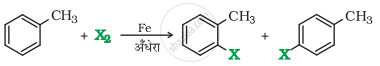 प्रकाश की अनुपस्थिति और आयरन की उपस्थिति में टॉलूईन क्लोरीन से अभिक्रिया द्वारा ______ देती है।