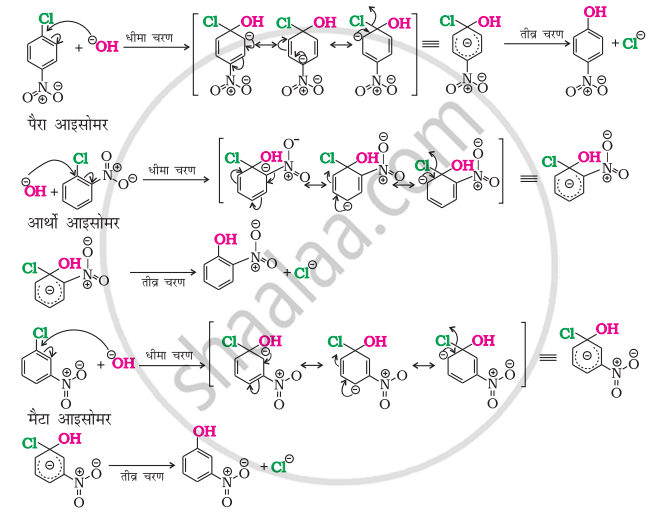 जैसा कि दर्शाया गया है, कि ऑर्थो- तथा पैरा-स्थिति पर नाइट्रो समूह को उपस्थिति से बेन्जीन वलय पर इलेक्ट्रॉन घनत्व कम हो जाता है। फलत: हैलोऐरीन पर नाभिकरागी का आक्रमण सरल हो जाता है।इस प्रकार बना कार्बऐनायन अनुनाद के द्वारा स्थायित्व प्राप्त कर लेता है। हैलोजन प्रतिस्थापी के स्थान से ऑर्थो- एवं पैरा-स्थितियों पर स्थित कार्बनों पर उत्पन्न ऋणावेश −NO2 के द्वारा स्थायित्व प्राप्त कर लेता है जबकि m-नाइट्रोक्लोरबेन्जीन में एक भी संरचना इस प्रकार की नहीं होती जिसमें −NO2 समूह कीउपस्थिति वाले कार्बन परमाणु पर ऋणावेश हो। अतः मेटा- स्थिति पर उपस्थित नाइट्रो समूह ऋणावेश को स्थायित्व प्रदान नहीं करता तथा मेटा- स्थिति पर उपस्थित −NO2 समूह का अभिक्रियाशीलता पर कोई प्रभाव प्रेक्षित नहीं होता।