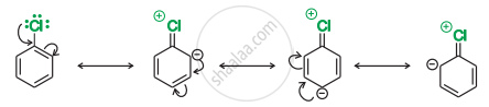 (i) हैलोऐरीन में हैलोजन परमाणु पर उपस्थित एकाकी इलेक्ट्रॉन युगल वलय के π इलेक्ट्रॉनों के साथ संयुग्मन में होते हैं तथा निम्नलिखित अनुनादी संरचनाएँ संभव हैं।