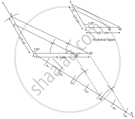 Δ AMT ∼ ΔAHE. In Δ AMT, MA = 6.3 cm, ∠MAT = 120°, AT = 4.9 cm, `(MA)/(HA) = 7/5`. construct Δ AHE.