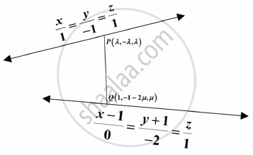 Let the coordinates of P be (λ, –λ, λ) and that of Q be (1, –2μ –1, μ); where 'λ' and 'μ' are scalars.