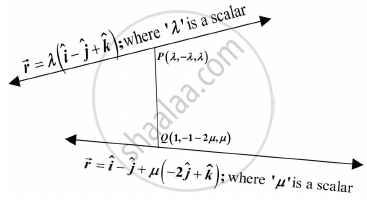 Now, the vector `vec(PQ) = vec(OQ) - vec(OP) = (1 - λ)hati + (-1 - 2μ + λ)hatj + (μ - λ)hatk`; (where 'O' is the origin), is perpendicular to both the lines, so the vector `vec(PQ)` is perpendicular to both the vectors `hati - hatj + hatk` and `-2hatj + hatk`.
