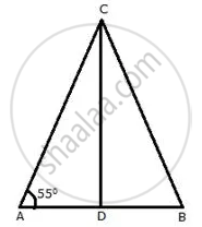An isosceles triangle ABC has AC = BC. CD bisects AB at D and ∠CAB = 55°.