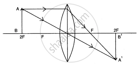An object is placed in front of a convex lens such that the image formed has the same size as that of the object. Draw a ray diagram to illustrate this.