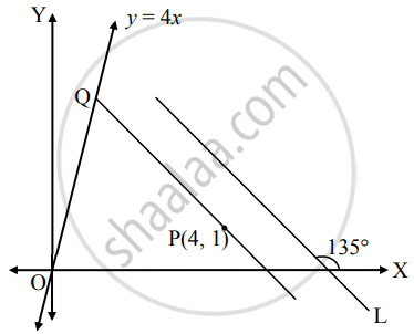 Find the distance of the line 4x − y = 0 from the point P(4, 1) measured along the line making an angle of 135° with the positive X-axis