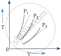 The following graph represents the T-V curves of an ideal gas (where T is the temperature and V the volume) at three pressures P1, P2 and P3 compared with those of Charles’s law represented as dotted lines.
