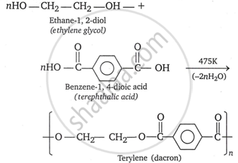 Terylene or Dacron: It is a copolymer of terephthalic acid and ethylene glycol. Terephthalic acid and ethylene glycol are condensation polymerized at about 475K to produce it.