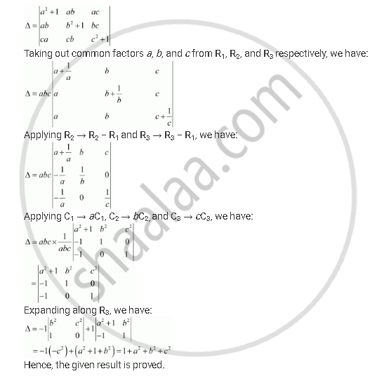 `|(a^2+1, ab, ac),(ab, b^2+1, bc),(ca, cb, c^2+1)| = 1+a^2+b^2+c^2`
