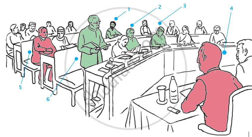 Can you identify the MLAs of the ruling party and the opposition in the illustration? Colour the ruling party in one colour and the opposition in another.