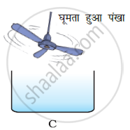 चित्र (A) तथा (C) में रखे द्रव का सतह क्षेत्र बड़ा तथा बराबर है, परंतु (C) में रखे द्रव के ऊपर घूमता हुआ पंखा होने के कारण वायु गति भी अधिक है। अत: बर्तन (C) में रखे द्रव में वाष्पण की दर सर्वाधिक होगी।
