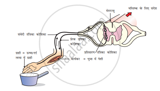 ग्राही → संवेदी तंत्रिका कोशिका → मेरुरज्जु → प्रेरक तंत्रिका कोशिका → कार्यकर (भुजा में पेशी)।