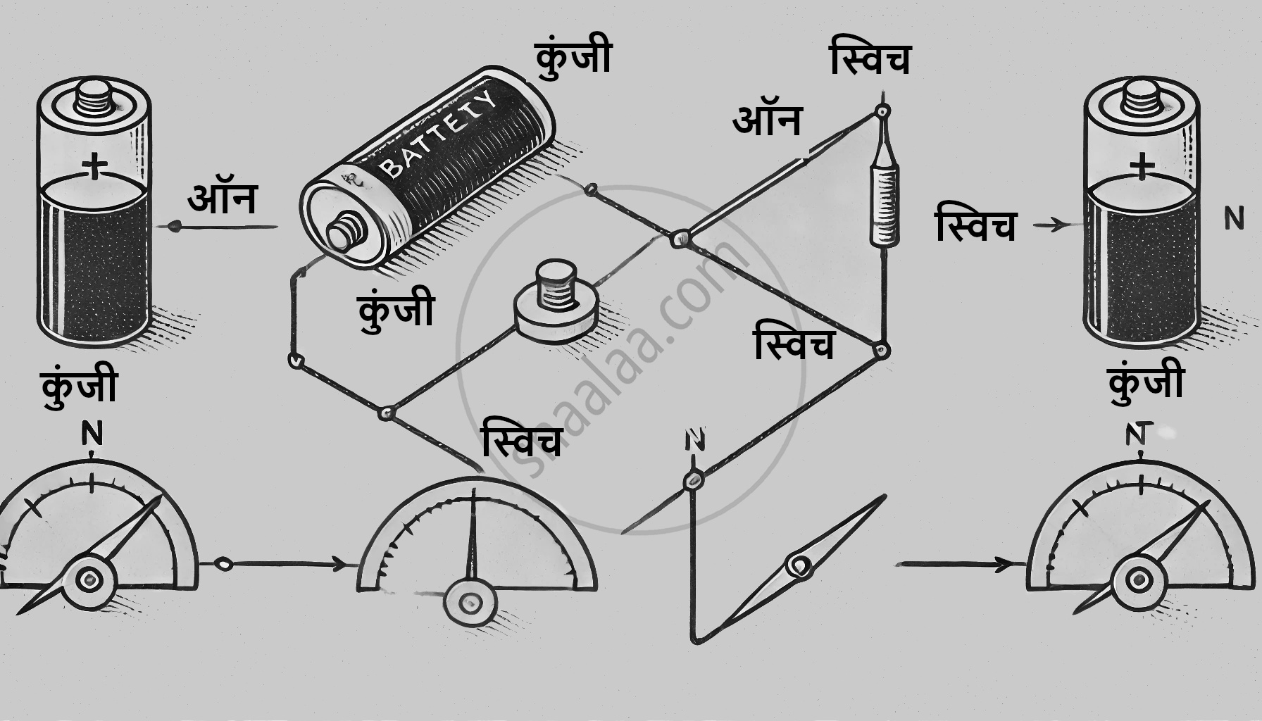 - चित्र में दिखाए गए अनुसार बैटरी, स्विच, तार और चुंबकीय सुई को जोड़ें।