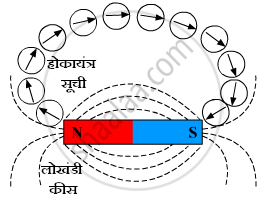 पट्टी चुंबकाभोवती असलेल्या चुंबकीय क्षेत्राची दिशा शोधण्यासाठी, पट्टी चुंबकाच्या एका ध्रुवाजवळ दक्षिण ध्रुवासह एक चुंबकीय होकायंत्र ठेवा. सुईचा उत्तर ध्रुव जिथे निर्देशित करतो तो बिंदू शोधा. आता, सुई उचला आणि त्याचा दक्षिण ध्रुव चिन्हांकित बिंदूवर ठेवा. आता, तो उत्तर ध्रुव कुठे निर्देशित करतो ते पुन्हा पहा. ही प्रक्रिया पुन्हा करा आणि तुम्हाला खाली दाखवल्याप्रमाणे चुंबकीय क्षेत्राची दिशा मिळेल.