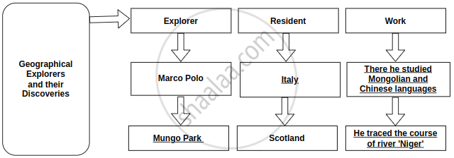 Complete the concept map. Geographical Explorers and their Discoveries Explorer Resident Work Marco Polo Scotland