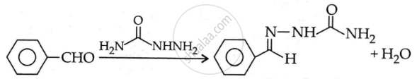 \ce{\underset{Benzaldehyde}{C6H5CHO} + \underset{Semicarbazide}{H2NCONHNH2} -> C6H5CH \underset{Benzaldehyde semicarbazide}{= NNHC - NH2} + H2O}\end{array}\]