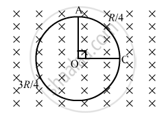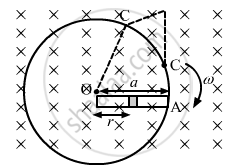 Consider the situation shown in the figure. Suppose the wire connecting O and C has zero resistance but the circular loop has a resistance Runiformly distributed along its length. The rod OA is made to rotate with a uniform angular speed ω as shown in the figure. Find the current in the rod when ∠ AOC = 90°.