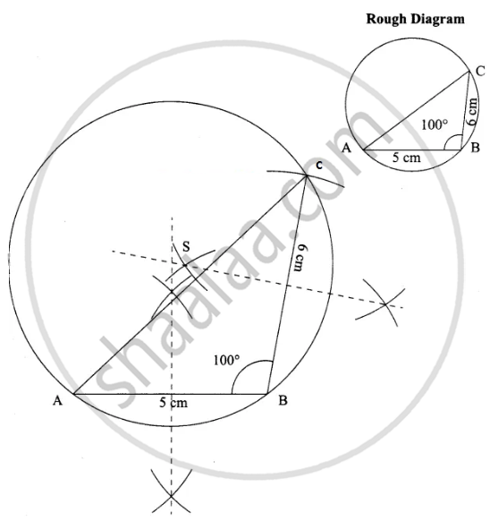Construct ΔABC with AB = 5 cm ∠B = 100° and BC = 6 cm. Also locate its circumcentre draw circumcircle