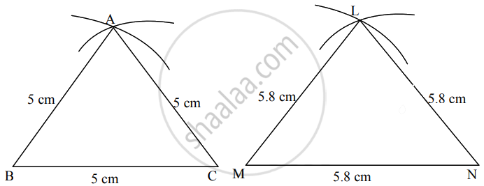 | ii. | Draw two arcs at 5 cm from point B and point C respectively. | Draw two arcs at 5.8 cm from point M and point N respectively. |