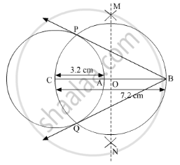 Construct tangents to the circle from the point B, having radius 3.2 cm and centre 'C'. Point B is at a distance 7.2 cm from the centre.