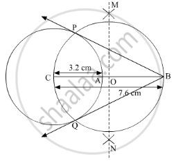 Construct tangents to the circle from the point B, having radius 3.2 cm and centre 'C'. Point B is at a distance 7.6 cm from the centre.